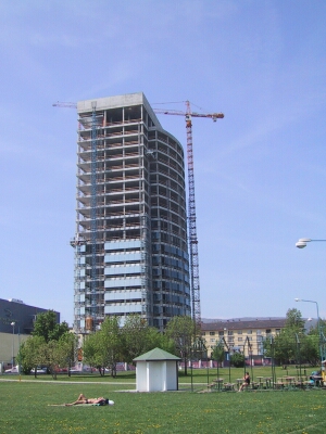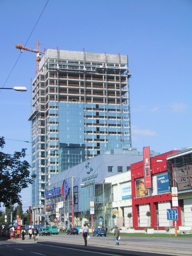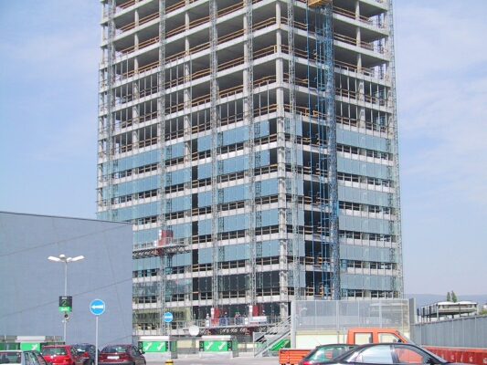 1 část - 10 pracovních plošin na akci POLUS Centrum AB 2 - Bratislava pro firmu METAL PROGRES. Výška budovy 85 m